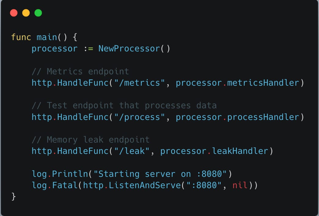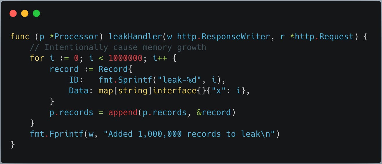 The below leakHandler is another service REST endpoint we use to cause a memory growth and leak so that we can monitor and resolve with pprof.