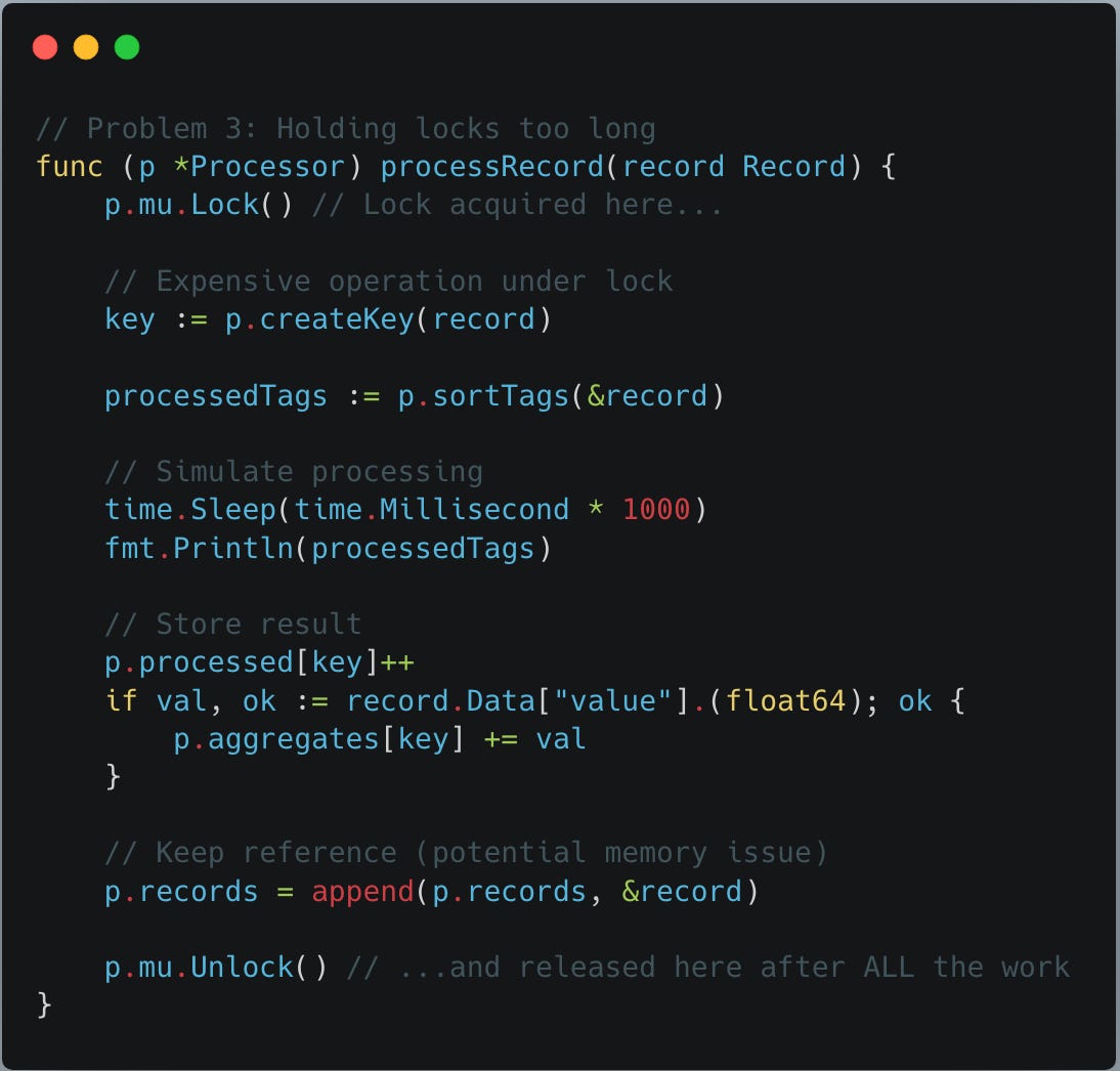 following processRecord func is doing the real work, processing record. However, to avoid race condition, it uses mutex to hold lock so that only one thread can process the whole process at a time. Problem with the locking implemented below is we locked whole func logic including the logic thats more time consuming and heavy duty. So, locking is held for longer during creating contention.