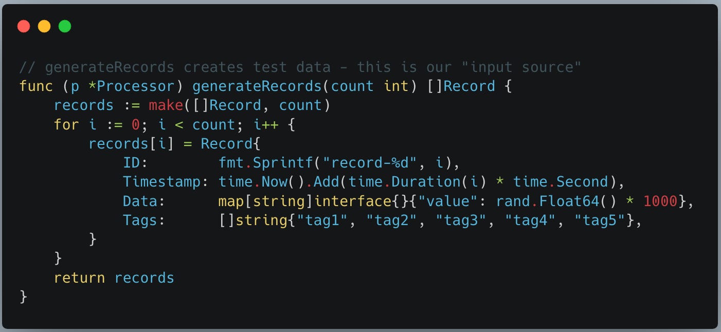 We create first func generateRecords and attach it to Processor struct. func generateRecords below helps us to generate test data as the input source for the processing.