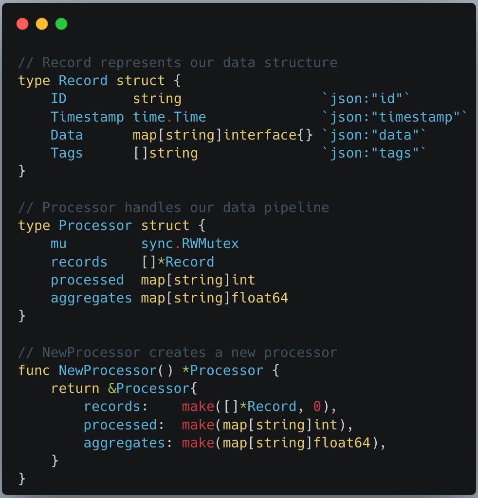In the code snippet above a Record represent a data record that we are processing with simple fields. Processor is where our pipeline logic will live to process this record using goroutines and a NewProcessor func to create and return an object pointer for the same.